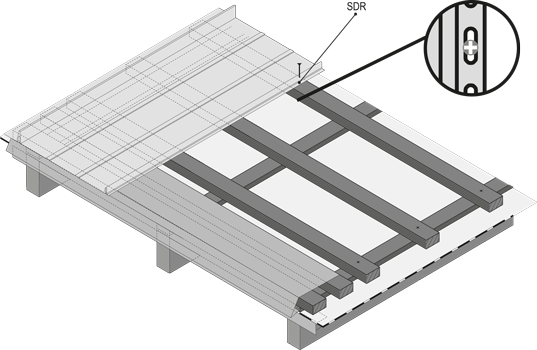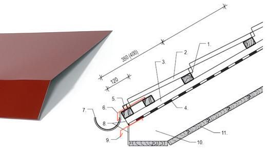 Legenda: 1. Laťování, 2. Střešní krytina, 3.Kontralať, 4.Difuzní folie, 5. Těsnění, 6. Okapní plech, 7 Podokpaní žlab, 8.Ochranný pás okapní, 9. Okapnice pro odvod kondenzátu z difuzní folie, 10. Krokev, 11. Podbití
